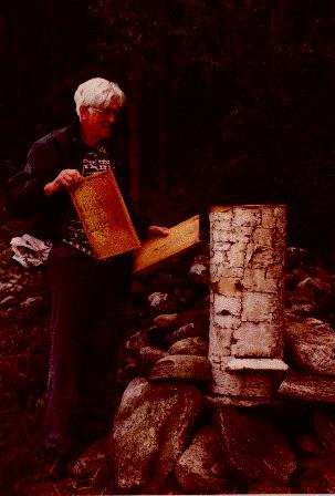 Harry Gunverth bredvid sin fina bistock som han och Sylve Gunverth tillverkade på mitten av 30-talet. Den är tillverkad av en ihålig stock och beklädd med björknäver.